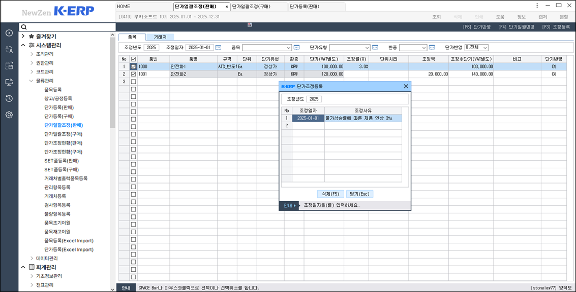 품목별/거래처별/직전단가(품목별)/직전단가(거래처별) 4가지 유형의 단가적용 및 단가 이력관리를 할 수 있습니다.