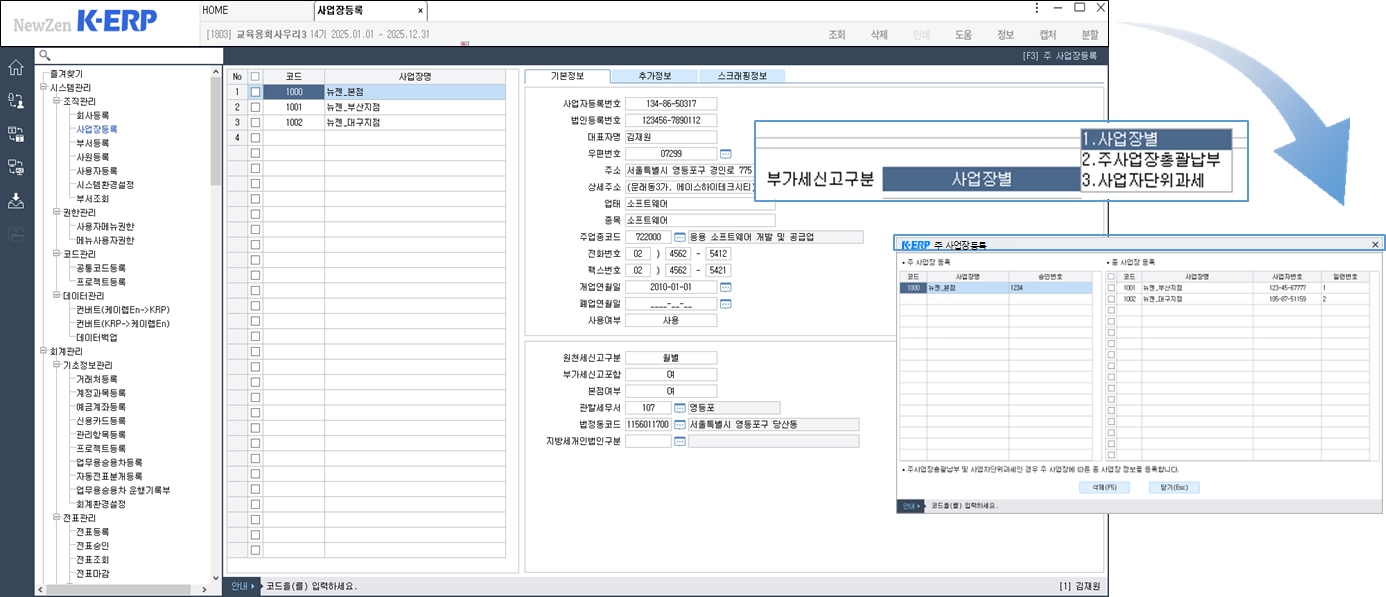 멀티사업장을 통해 부가세/원천세 유형별 신고 및 사업장별 또는 본점일괄 결산작업을 할 수 있습니다.