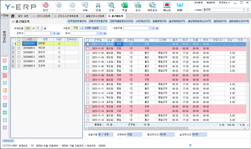 - 급여계산식을 설정하여 사원별 근태 현황에 따른 연장근로수당과 변동 급여 계산 가능
